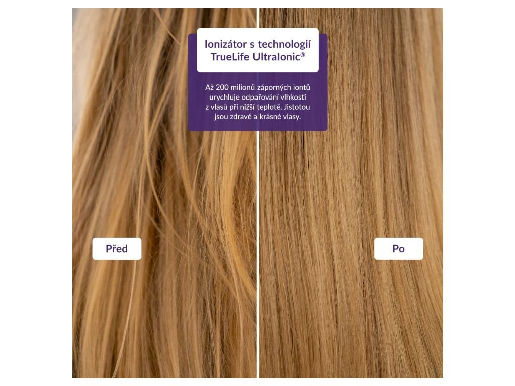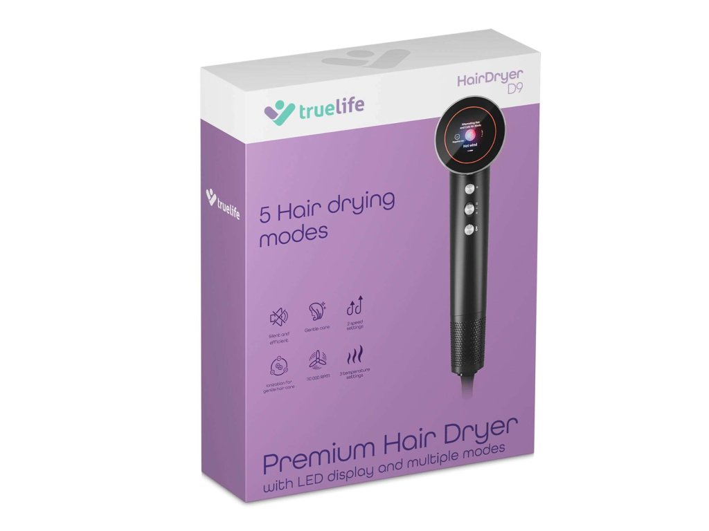 TrueLife HairDryer D9 patrí ku špičke vo svojej kategórii. Jeho ionizátor s technológiou TrueLife UltraIonic produkuje až 200 miliónov záporných iónov pre hladšie a zdravšie vlasy. Vlhkosť sa z dlhých a polodlhých vlasov odparí rýchlejšie a pri nižšej teplote. Šetrnosť a rýchlosť sušenia je tiež zásluhou motora s technológiou TrueLife UltraFlow, ktorý dosahuje až 110 000 otáčok za minútu. Praktickou výbavou fénu je okrúhly farebný LED displej, ktorý prehľadne zobrazuje všetky informácie o fúkaní, t. j. zvolený režim, rýchlosť alebo ionizáciu.
