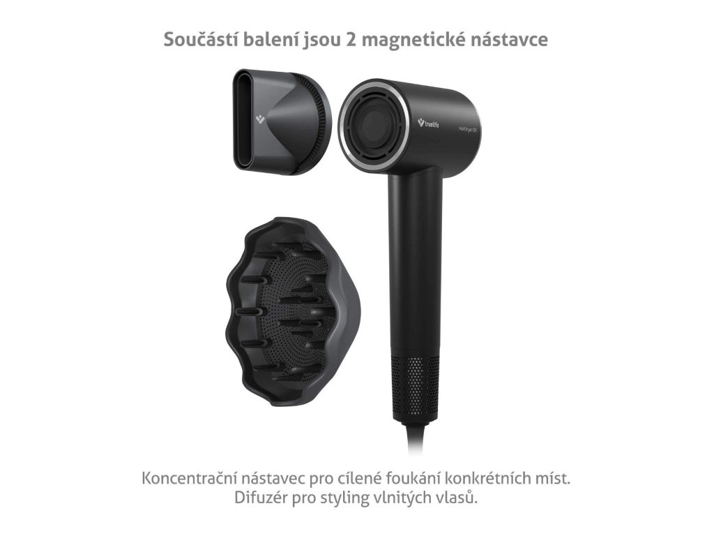 Fén sa dodáva s 2 nadstavcami, ktoré sa dajú rýchlo nainštalovať vďaka magnetu. Okrem fúkania môžete s nimi ľahko vytvárať aj styling. Na cielené fúkanie a úpravu konkrétnych miest použite koncentračný nadstavec. Difúzor dokáže udržať vlasy oddelené a zvýrazniť ich pri korienkoch.