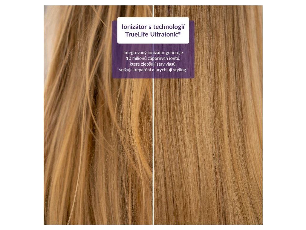 Zoznámte sa s novou kráľovnou vašej kúpeľne pre rýchly a prirodzený styling, žehličkou na vlasy TrueLife HairIron N3 s veľkým LED displejom. Vlasy narovná s maximálnou starostlivosťou a zanechá ich také hebké, že sa ich budete chcieť stále dotýkať. Na prvý pohľad zaujme svojím dizajnom so zaoblenými hranami, ktoré umožňujú aj tvorbu vlniek. Ešte viac si vás získa luxusný keramický povrch nahrievacích doštičiek, ktoré sa rýchlo zahrievajú, udržiavajú teplo rovnomerne rozložené, čím chránia vlasy pred poškodením a vysušením a dodávajú im dokonalý lesk. Dokonalý účes a vyživenejšie vlasy zabezpečí ionizátor s technológiou TrueLife UltraIonic, vďaka ktorej sa vlhkosť z vlasov rýchlejšie odparí aj pri nižšej teplote. Žehlička ponúka až 12 možností nastavenia teploty, takže si starostlivosť môžete prispôsobiť presne na mieru svojim vlasom. K pohodlnému používaniu prispieva aj kábel otočný o celých 360° a zámok, ktorý uľahčuje skladovanie, napríklad na cestách.