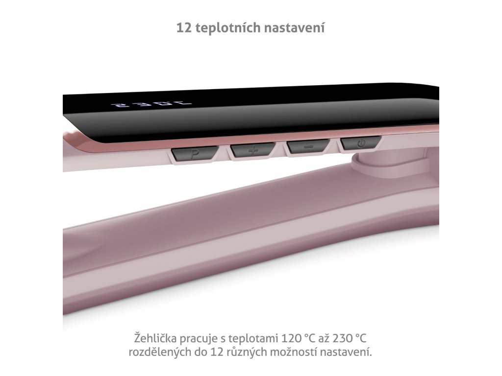 Žehlička pracuje s teplotami od 120 °C do 230 °C rozdelenými do 12 rôznych možností nastavenia.