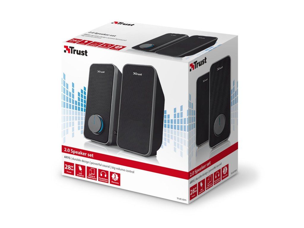 Reproduktory s hezkým designem, bohatým zvukem a hlubokými basy pro počítač a notebook Specifikace produktu: * Špičkový výkon 28 W (14 W RMS) * Velké a snadno dostupné ovládání hlasitosti na přední straně * Kovová mřížka zajišťuje lepší ochranu * Připojení sluchátek * Vstupní konektor pro tablet, telefon nebo přehrávač mp3 * Napájení z USB – nemusíte zapojovat do zásuvky Obsah balení: * Reproduktory s připojeným kabelem * Návod k použití Systémové požadavky: * PC nebo notebook s 3,5mm zvukovým připojením * Port USB pro napájení Více na webu výrobce: https://www.trust.com/en/product/20179-arys-2-0-speaker-setDodatočné parametre