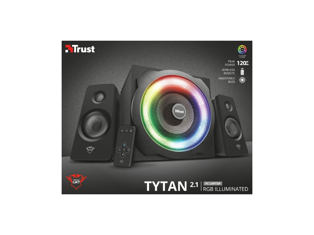 -120W špičkový výkon (60 W RMS) -Pro PC, notebook, televizi, smartphone a tablet -Dřevěný subwoofer pro bohatý a výkonný zvuk -Přednastavené světelné režimy: 7 barev synchronizovaných na basu, RGB dýchání, rotační RGB, synchronizované RGB -Včetně bezdrátového dálkového ovladače pro ovládání napájení, hlasitosti, basů a světel -Inteligentní řízení spotřeby: při nepoužívání se přepne do pohotovostního režimu -Typ zapojení: 3,5mm -Výstup: 120W -Výstup (RMS): 60W -Frekvenční rozsah: 20 - 20000 Hz -Impedance: 4 Ohm -Hmotnost: 4240g -Odpojitelný napájecí kabel -Dálkové ovládání Odkaz na stránky výrobce https://www.trust.com/en/product/22944-gxt-629-tytan-2-1-rgb-speaker-setDodatočné parametre