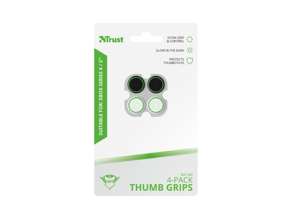 Trust GXT 267 4-pack Thumb Grips pro Xbox. Sada 4 palcových gripů pro váš ovladač Xbox Series X pro extra úchop a kontrolu. Máte novou konzoli Xbox Series X nebo Xbox Series S? Vítejte v hraní nové generace! Aby se vám váš nový ovladač dobře uchopil, jsou zde tyto Trust Thumb Grips. Tato sada má celkem 4 návleky z nichž dva svítí ve tmě, což vám pomůže udržet palce na analogových páčkách i v noci. Klíčové vlastnosti *Každý grip má několik teček pro extra úchop a kontrolu *Zabraňuje opotřebení ovladače *Snadno se instaluje, odstraňuje a čistí Odkaz na web výrobce: https://www.trust.com/en/product/24174-gxt-267-4-pack-thumb-grips-for-xboxDodatočné parametre