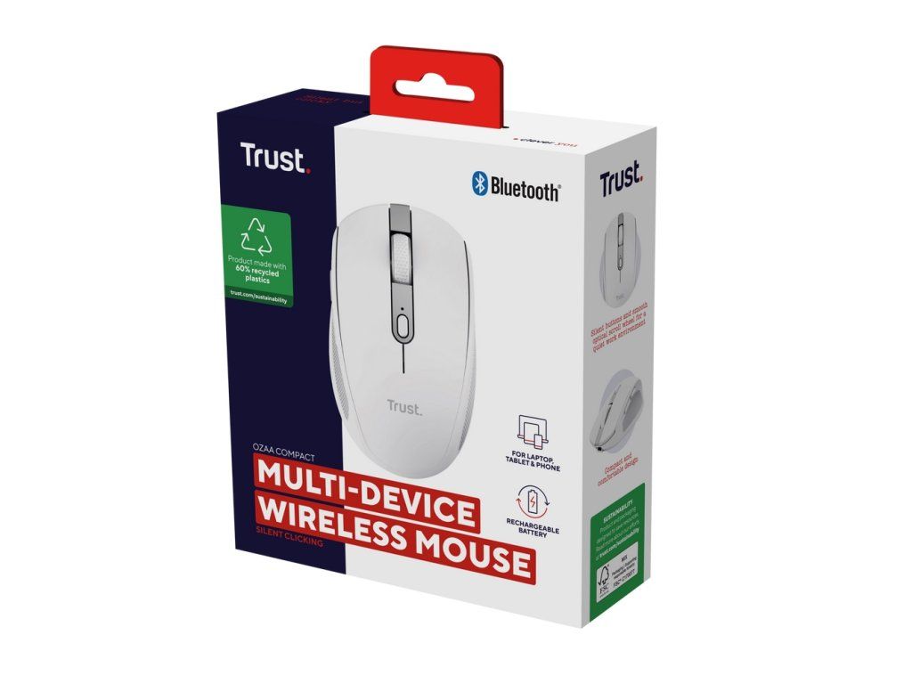 Trust Ozaa kompaktní bezdrátová myš s možností připojení k více zařízením a tichými tlačítky * snadné připojení až tří zařízení najednou prostřednictvím jediného přijímače USB 2,4GHz nebo přes Bluetooth® * ekologické provedení – vyrobeno z 60% z recyklovaných plastů * snadné přepínání připojení stisknutím vyhrazených tlačítek na myši * podpora více operačních systémů (Windows, iOS, iPadOS, MacOS, Android, Chrome OS) * tichá tlačítka myši pro produktivní a tiché pracovní prostředí * vestavěná dobíjecí baterie s ukazatelem nízké úrovně nabití a vypínačem Technické parametry Rolovací kolečko: ano Počet tlačítek: 6 Rozhraní/konektivita: RF 2,4GHz, Bluetooth, (USB-C) Bezdrátový dosah: 10m Napájení: dobíjecí baterie (nabíjení přes USB-C kabel) Výdrž baterie: až 1 měsíc Nastavitelné DPI: ano (800dpi - 3200dpi) Rozlišení senzoru: 800, 1600, 3200dpi Snímač pohybu: optický Barva: bílá Rozměry: 105×64×37mm Hmotnost: 68g Doporučené požadavky na systém: - volný port USB nebo Bluetooth - Windows, macOS, iOS, Chrome OS Obsah balení: * myš * přijímač micro USB s možností uložení * nabíjecí kabel * návod k použití Záruka: 2 roky Odkaz na stránku výrobce: https://www.trust.com/en/product/24933-ozaa-compact-multi-device-wireless-mouse-whiteDodatočné parametre
