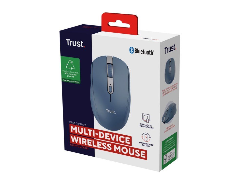 Trust Ozaa kompaktní bezdrátová myš s možností připojení k více zařízením a tichými tlačítky * snadné připojení až tří zařízení najednou prostřednictvím jediného přijímače USB 2,4GHz nebo přes Bluetooth® * ekologické provedení – vyrobeno z 60% z recyklovaných plastů * snadné přepínání připojení stisknutím vyhrazených tlačítek na myši * podpora více operačních systémů (Windows, iOS, iPadOS, MacOS, Android, Chrome OS) * tichá tlačítka myši pro produktivní a tiché pracovní prostředí * vestavěná dobíjecí baterie s ukazatelem nízké úrovně nabití a vypínačem Technické parametry Rolovací kolečko: ano Počet tlačítek: 6 Rozhraní/konektivita: RF 2,4GHz, Bluetooth, (USB-C) Bezdrátový dosah: 10m Napájení: dobíjecí baterie (nabíjení přes USB-C kabel) Výdrž baterie: až 1 měsíc Nastavitelné DPI: ano (800dpi - 3200dpi) Rozlišení senzoru: 800, 1600, 3200dpi Snímač pohybu: optický Barva: modrá Rozměry: 105×64×37mm Hmotnost: 68g Doporučené požadavky na systém: - volný port USB nebo Bluetooth - Windows, macOS, iOS, Chrome OS Obsah balení: * myš * přijímač micro USB s možností uložení * nabíjecí kabel * návod k použití Záruka: 2 roky Odkaz na stránku výrobce: https://www.trust.com/en/product/24934-ozaa-compact-multi-device-wireless-mouse-blueDodatočné parametre