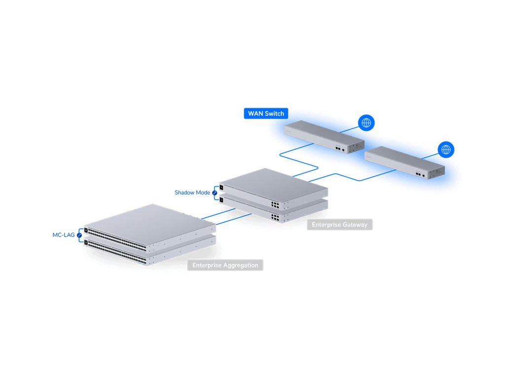 10G SFP+ WAN Switch pro zapojení dvou routerů se službou Shadow Mode High Availability UniFi Gateways do infrastruktury jednoho poskytovatele připojení = ISP.