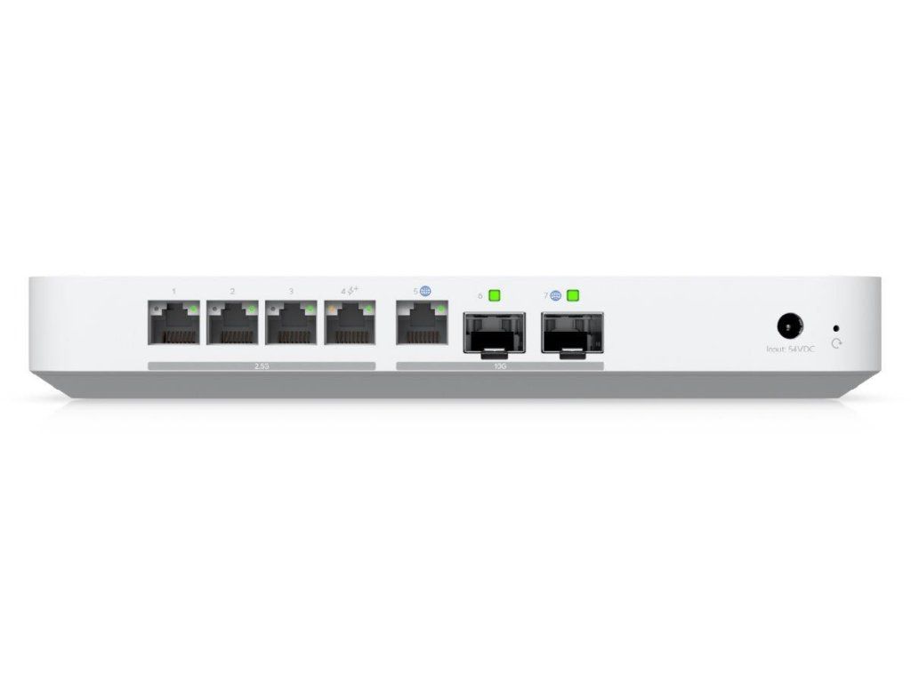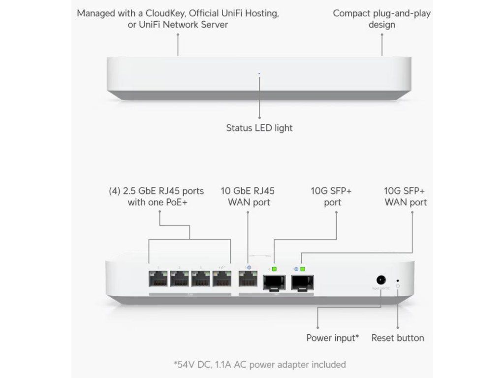Popis produktu UXG-Fiber je kompaktní 10 gigabitový router, který disponuje (1) WAN 10Gbps portem, (2) 10Gbps SFP+ porty (1x WAN, 1x LAN) a (4) LAN 1/2.5Gbps porty s jedním PoE-OUT portem s podporou PoE+ 802.3af/at. Kompaktní, ale výkonné provedení tak podporuje funkci multi-WAN včetně možnosti load balancing, nechybí podpora IDS/IPS. Router má implementovanou podporu různých typů VPN, včetně site-to-site VPN. Napájení je řešeno prostřednictvím napájecího adaptéru 54V/1,1A, napájecí adaptér je součástí balení. Klíčové vlastnosti • 5Gbps routing s podporou IDS/IPS • (1) WAN 10Gbps + (1) 10Gbps SFP+ WAN • (4) 2.5Gbps LAN + (1) 10Gbps SFP+ • Multi-WAN + load balancing • Podpora VPN, včetně site-to-site VPN Obsah balení • Zařízení • Patch kabel • Napájecí adaptér 54V/1,1A Technické parametry Konektory a rozhraní Rychlosti WAN:(1) 1/2.5/10Gbps + (1) 10Gbps SFP+ Možnost více WAN:Ano Rychlost LAN:(4) 10/100/1000/2500Mbps Gigabit LAN:Ano Optické rozhraní:(2) 10Gbps Napájení Typ napájení:DC konektor Typy PoE:PoE-Out (pouze) Podporované PoE-Out standardy:802.3af, 802.3at Počet PoE Out portů:1 Max. spotřeba energie [W]:25 Napájení přes konektor/svorkovnici:54V / 1,1A Fyzické charakteristiky Provedení:Desktop Šasi:Plastové Tlačítka:Reset Provozní teplota [°C]:0 až 40 Hmotnost [g]:605 Šířka [mm]:213 Výška [mm]:30 Hloubka [mm]:128 Hardware CPU:ARM Cortex-A73 Frekvence CPU [MHz]:2200 Počet CPU jader:4 RAM [MB]:2048 Software Podporované VPN:L2TP, IPSec, OpenVPN, WireGuard Management:UniFi Network Podpora IPv6:AnoDodatočné parametre