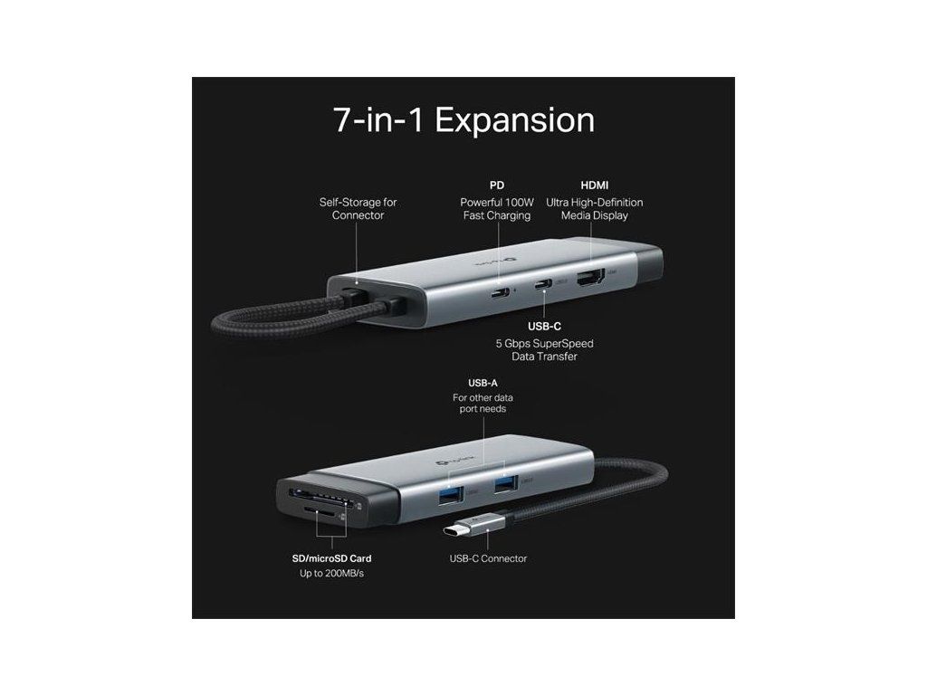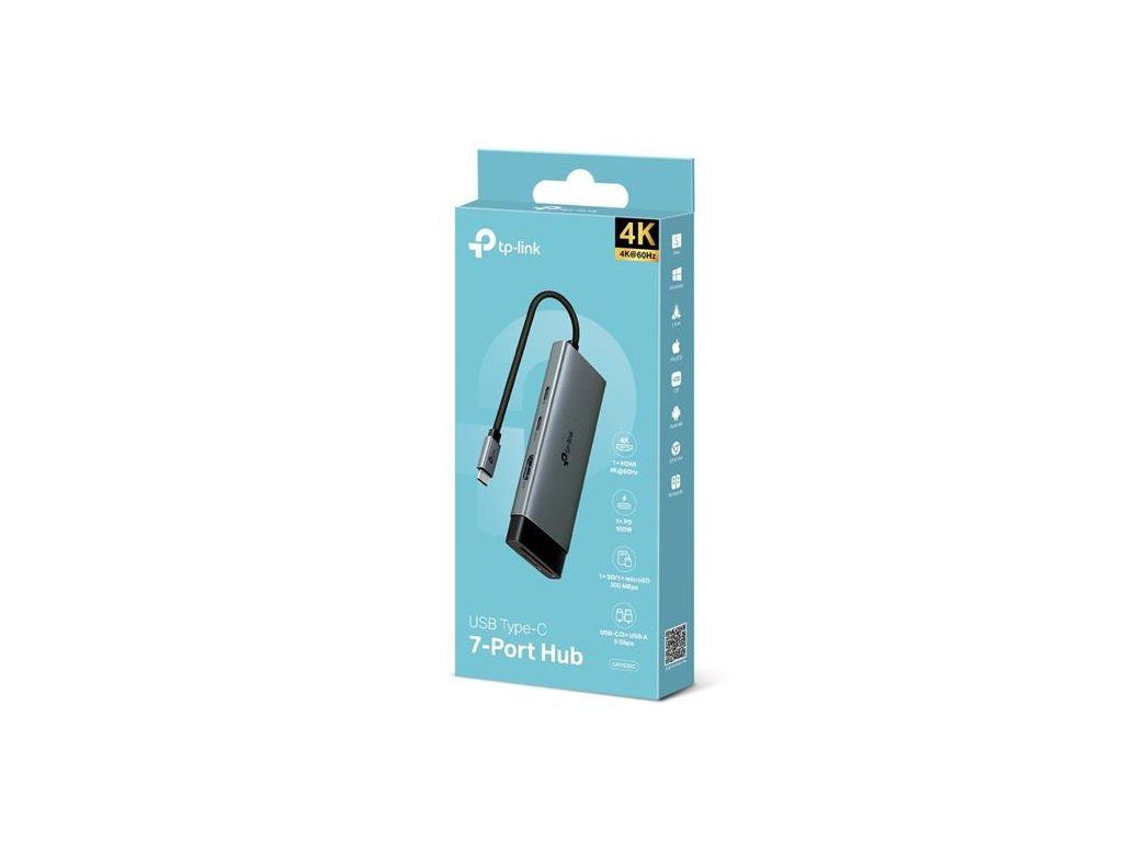 Hub USB-C 7 v 1: UH7020C mení jeden port USB-C na 7 portov s HDMI 4K pri 60 Hz, SD a microSD UHS-I, 100 W Power Delivery, 1× dátový port USB-C, 2× dátový port USB- A.