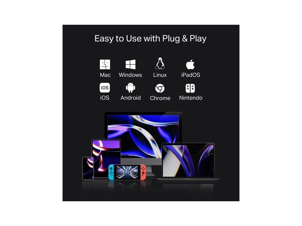 Jednoduché použitie vďaka Plug & Play: Vďaka inštalácii bez ovládačov s operačnými systémami Mac OS, Windows 11/10/8.1/8/7, Linux OS, iPadOS, iOS, Android, Chrome OS a Nintendo OS stačí pripojiť a počas niekoľkých sekúnd začať používať .