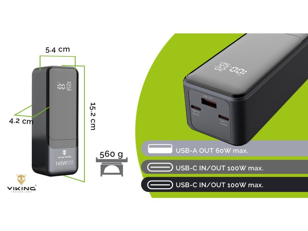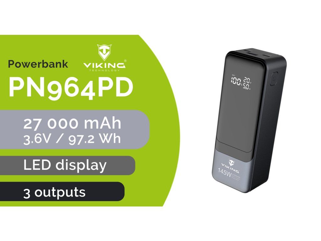Powerbanka Viking PN-964PD 27000 mAh • Kapacita: 27000mAh/ 97.2Wh • Maximální výkon: 145W • Rychlé nabíjení PD a QC • Vstupy a výstupy (USB-A, USB-C) • Vestavěný inteligentní čip (MCU) • Funkce Pass-Through • LED display • Nabíjení notebooku Viking PN-964PD 27000mAh, 145W Powerbanka Viking PN-964PD 27000mAh je svým zpracováním, spolehlivostí a variabilitou, špičkou mezi záložními zdroji. Díky podpoře rychlého nabíjení a široké kompatibilitě je skvělým řešením pro každodenní použití i náročnější situace na cestách. Zároveň poskytuje pokročilou ochranu jak pro samotnou powerbanku, tak pro připojená zařízení. Powerbanka také podporuje funkci Pass-through současného nabíjení a vybíjení. Díky kapacitě 27000 mAh (97.2Wh) a maximálnímu výkonu až 145 W nabízí perfektní rovnováhu mezi výkonem, hmotností a snadnou přenositelností. Bez problémů zvládne pohotové dobití mobilních telefonů, tabletů, čteček knih, GPS navigací, kamer, svítilen a další běžné elektroniky. Díky vysokému výkonu je také ideální pro nabití notebooků. Klíčové vlastnosti: • Kapacita baterie 27000mAh (97.2Wh) • Podpora rychlého nabíjení (USB-C Power Delivery a Qualcomm Quick Charge) • 1x USB-A a 2x USB-C výstup • USB-A a USB-C vstup pro dobíjení powerbanky • Automatická detekce připojeného zařízení díky MCU čipu • Inteligentní ochrana proti přepětí, přehřátí a přebití • LED display ukazuje stav nabití baterie a identifikace QC/PD nabíjení • Funkce Pass-through pro současné nabíjení a vybíjení • Kompaktní rozměry a nízká hmotnost – ideální na cesty i každodenní použití • Vhodná pro nabíjení mobilních telefonů, sluchátek, chytrých hodinek a dalších zařízení • S výkonem až 145 W vhodná pro nabíjení notebooku Maximální flexibilita - nabíjejte rychle a bez omezení 1x výstupní USB-A port a 2x USB-C Vám zajistí nabíjení až 3 různých zařízení současně! USB-A port podporuje rychlonabíjení podle standardu QC s maximálním výkonem 60W. Dva USB-C porty slouží jako vstup i výstup a každý podporuje rychlonabíjení PD s maximálním výkonem 145W. Powerbanka tak podporuje i vlastní rychlonabíjení stejným výkonem až 100W vstup. Podpora rychlonabíjení PD a QC Powerbanka Viking PN-964PD 27000mAh podporuje moderní technologie rychlého nabíjení PD (Power Delivery) a QC (Quick Charge), díky kterým nabijete kompatibilní zařízení mnohem rychleji než běžnou nabíječkou – například mobil až na 50?% kapacity za krátkou dobu. Funguje jak s Androidem, tak s Apple zařízeními, pokud podporují rychlé nabíjení. Vestavěný inteligentní čip (MCU) automaticky rozpozná připojené zařízení a upraví výstupní výkon tak, aby bylo nabíjení rychlé, bezpečné a šetrné k baterii. Obsah balení: 1 ks Powerbanka Viking PN-962PD 20000mAh Technické specifikace: Značka: Viking Model: PN-964PD 27000mAh Kapacita baterie: 3.6V / 27000mAh / 97.2Wh Baterie: Li-ion polymer Rozměr: 15.2 x 5.4 x 4.2 cm Váha: 560g USB-A výstup: 10V/2.25A, 5V/3A, 9V/3A, 12V/3A, 15V/3A (60W max.) USB-C 1 výstup/vstup: 5V/3A, 9V/3A ,12V/3A, 15V/3A , 20V/5A (100W max.) USB-C 1 výstup/vstup: 5V/3A, 9V/3A, 12V/3A, 15V/3A, 20V/5A (100W max.) Nabíjecí doba: s podporou QC/PD cca 4 hod. Min. počet nabití: 800x (garance min. počtu nabití, při kterém neklesne kapacita pod 80% původní kapacity baterie) Příslušenství: návod v ČJ, USB-A - USB-C kabel Certifikace: CE, FC, RohsDodatočné parametre